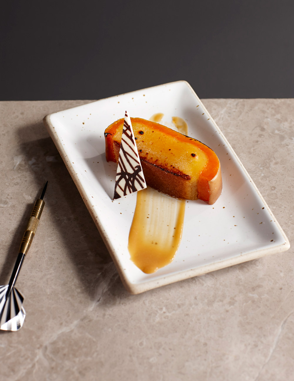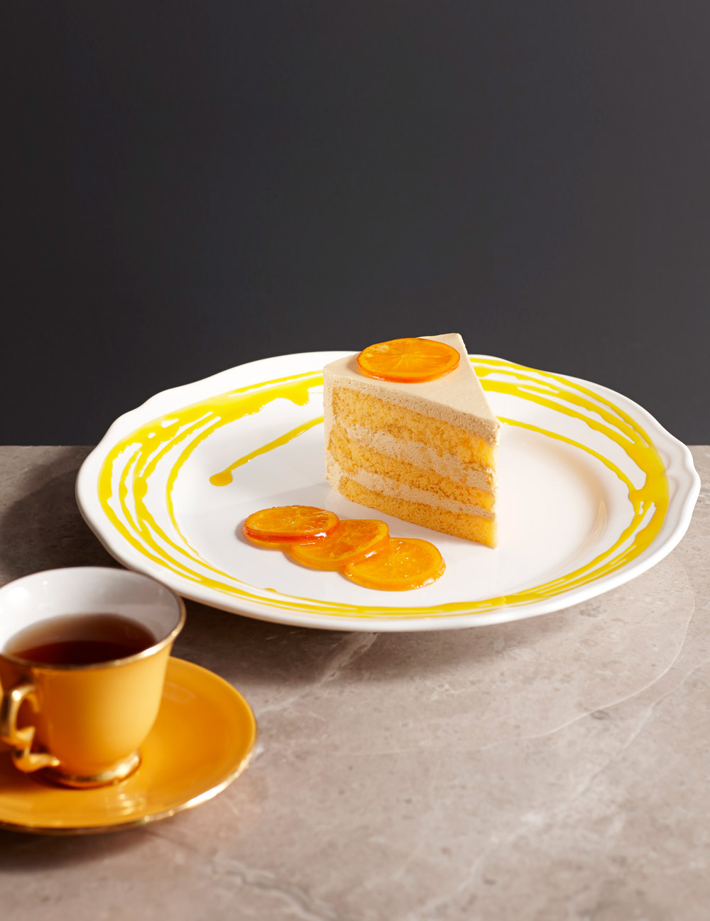 Fresh orange chiffon cake, caramel mousse, Mandarin orange confit and light suzette sauce.