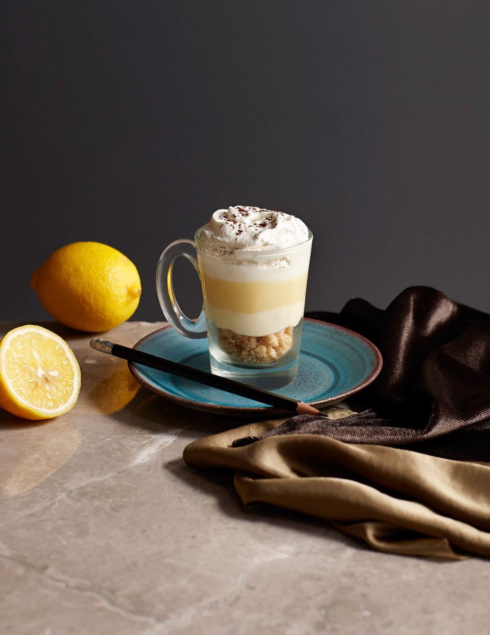 Very tasty crumble tart with hidden explosive taste of lemon curd, mascarpone, served with whipped cream and coffee powder.