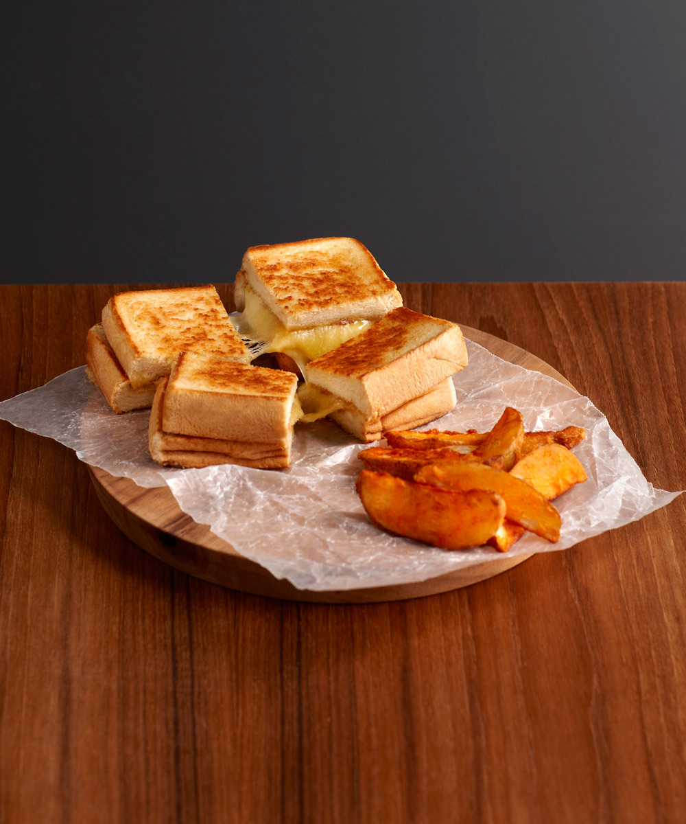 Toasted white or whole wheat sandwich with Gruyere, Emmental, Cheddar and Parmesan. Served with home fries.