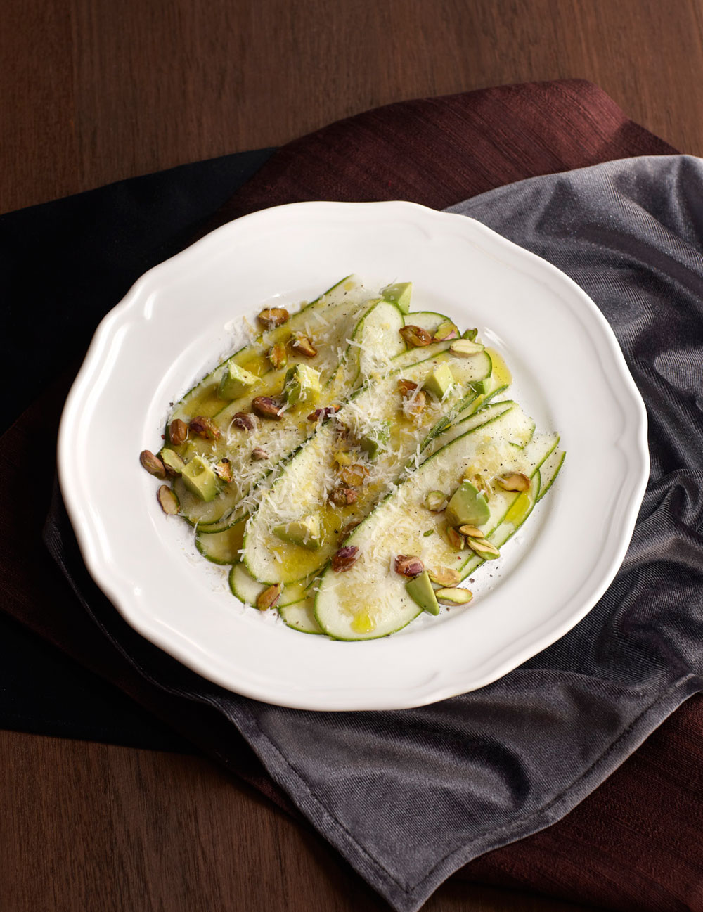 Chilled shaved zucchini, avocado, pistachio, Parmesan, extra virgin olive oil, lemon zest, lemon juice and sea salt.