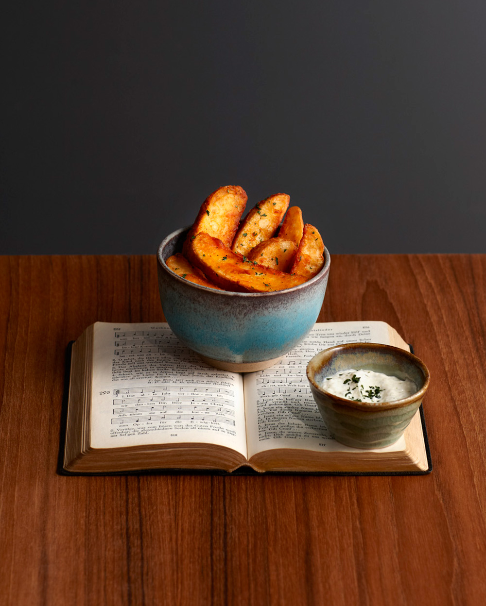 Chunky cut potato wedges with skin, sea salt, chopped parsley and aioli sauce.