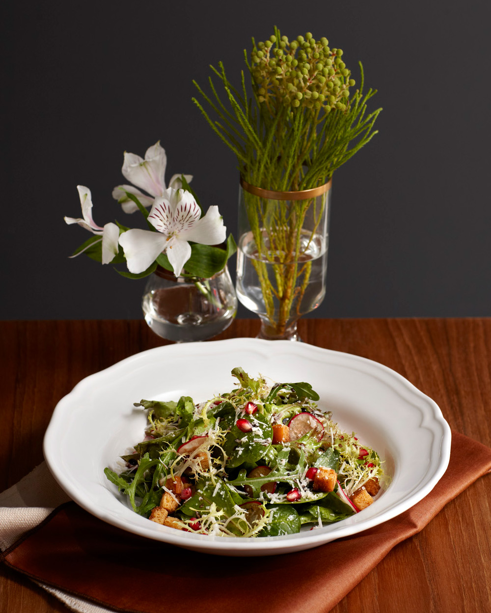 Wild rocket, frisee, pomegranate seeds, watercress, topped with Parmesan and balsamic vinaigrette.