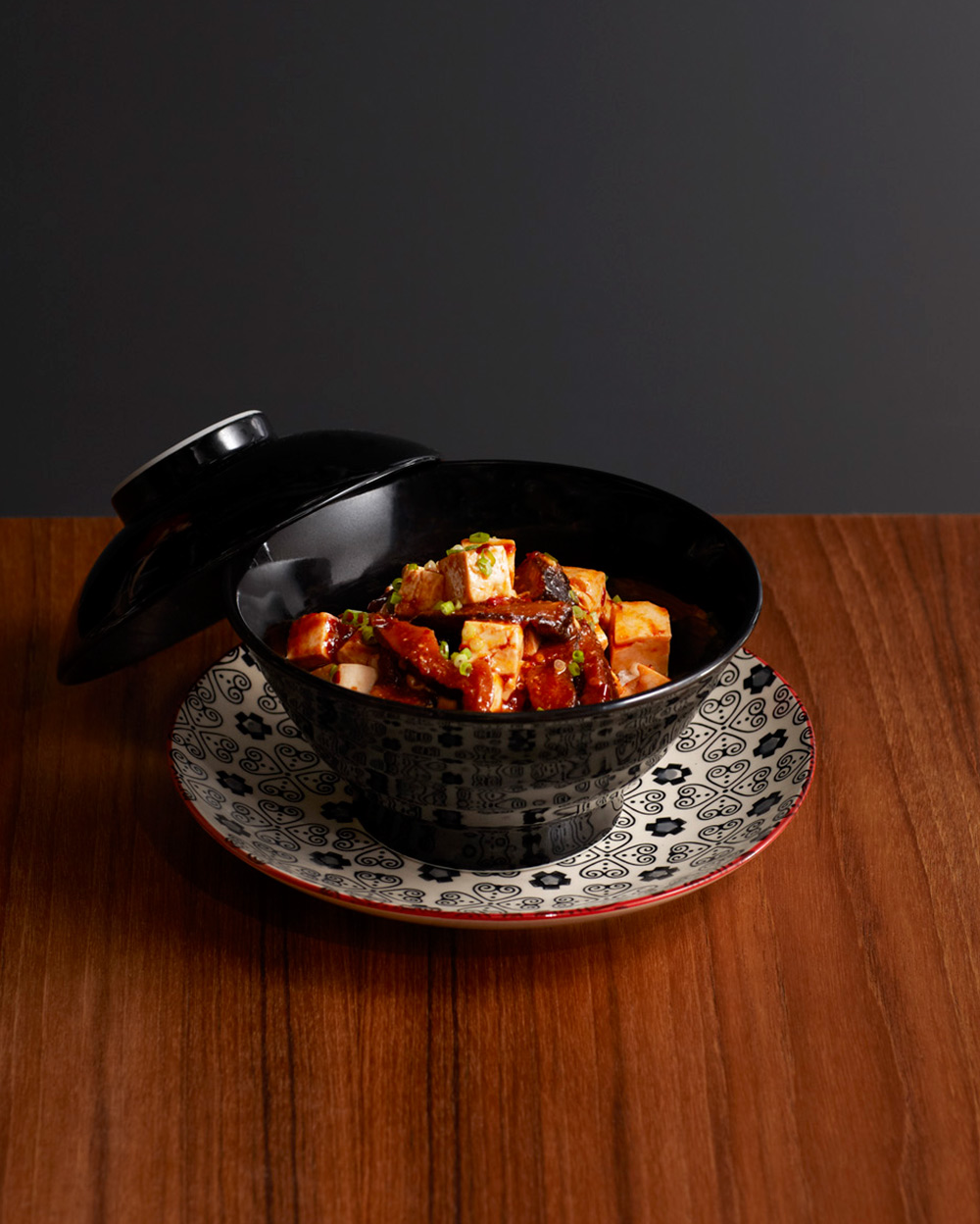 Stir-fried soft tofu with sambal and kimchi paste. Served with Japanese rice and wakame soup.
