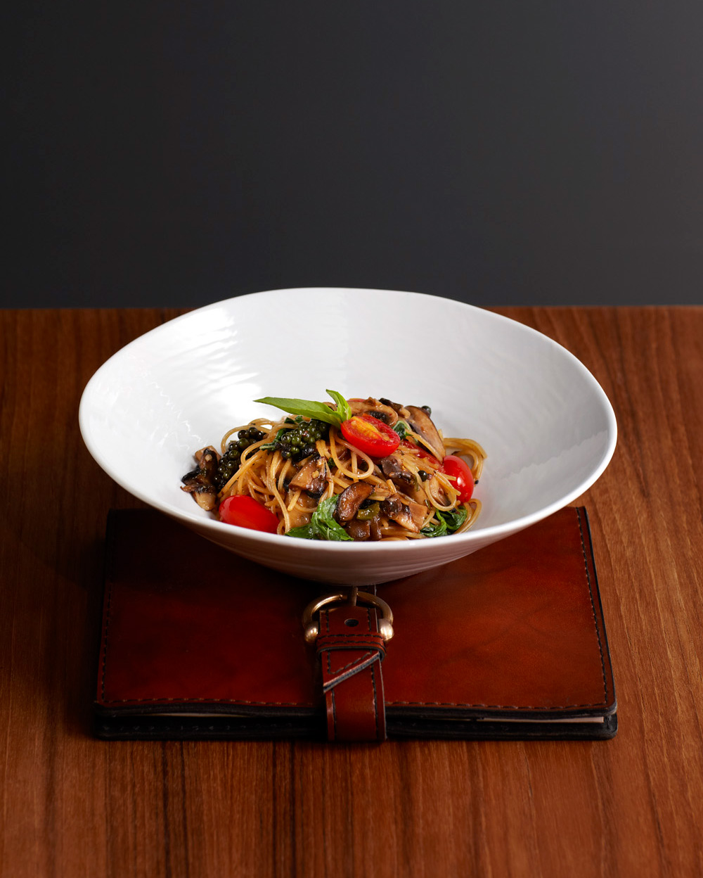 Stir-fried spaghetti with shitake, Portobello mushroom, champignon, chilies, garlic and basil.