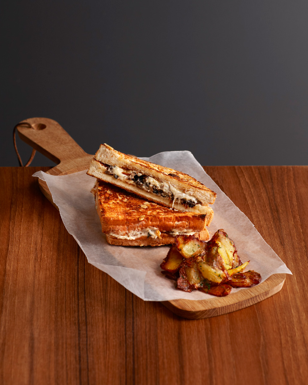 Toasted white or whole wheat sandwich with Gruyere, caramelized onion, mixed mushroom and béchamel sauce. Served with fried potato skin.