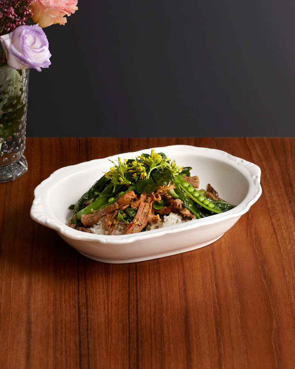 Stir-fried mushroom stem with chili, garlic and crispy holy basil. Served with jasmine rice and wakame soup.