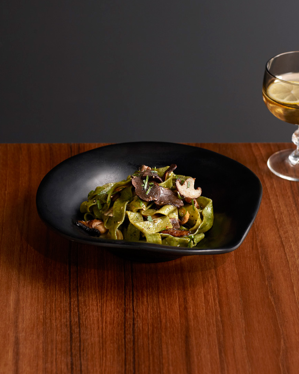 Homemade spinach tagliatelle with Portobello mushroom, shitake, champignon, truffle, olive oil and chilies.