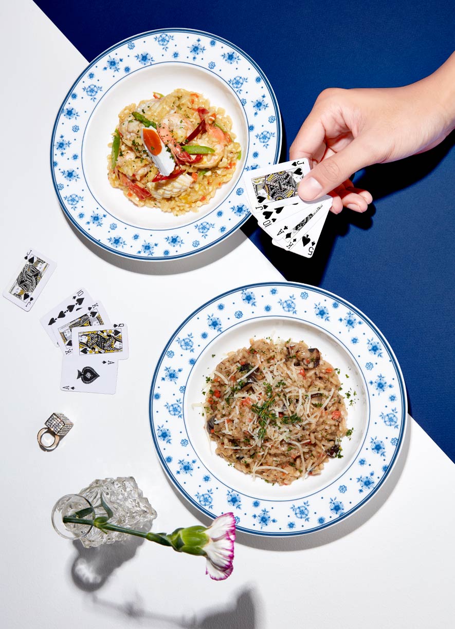 Saffron Risotto with shrimps, squid, asparagus, salted egg and Gruyere.