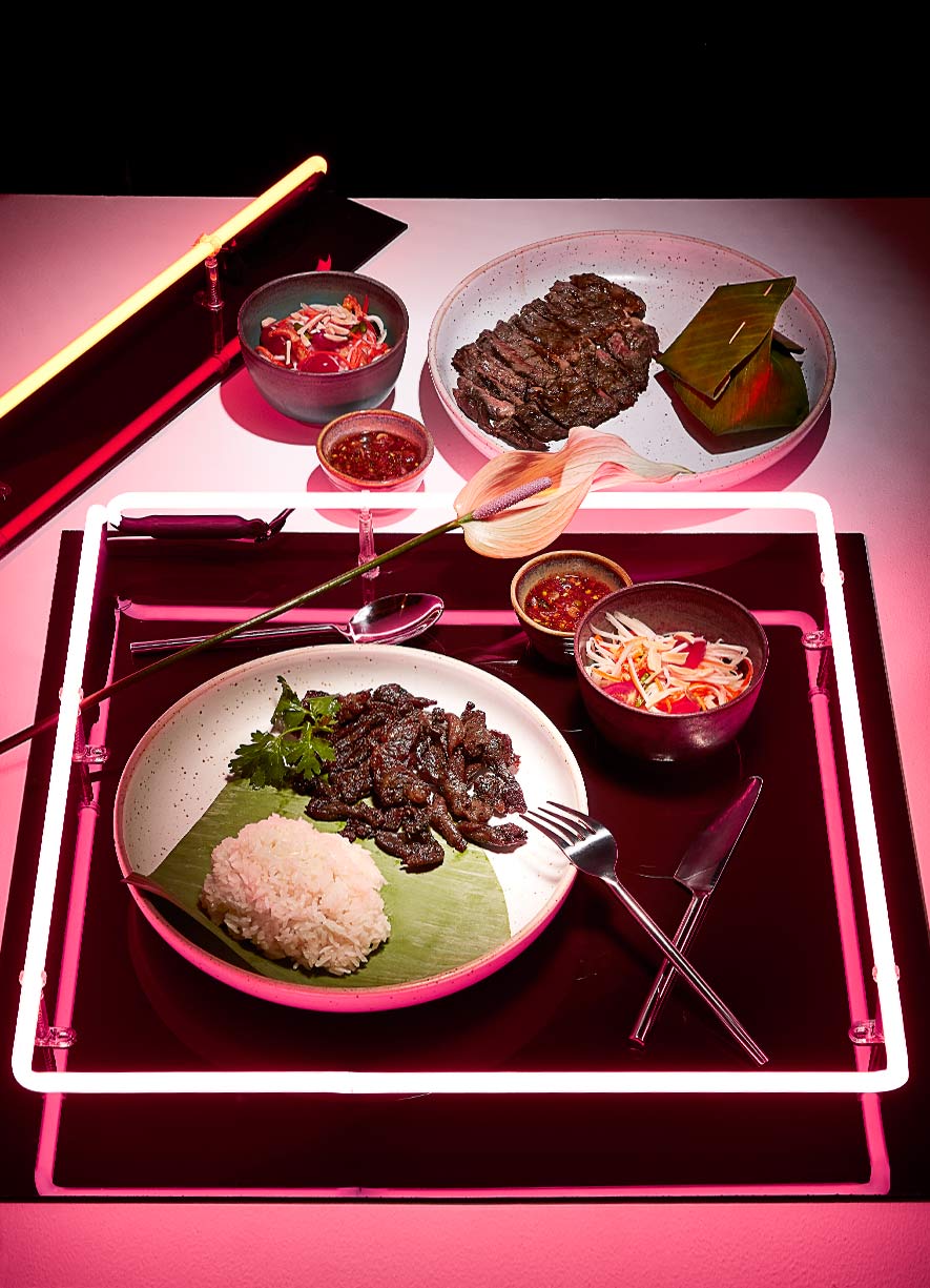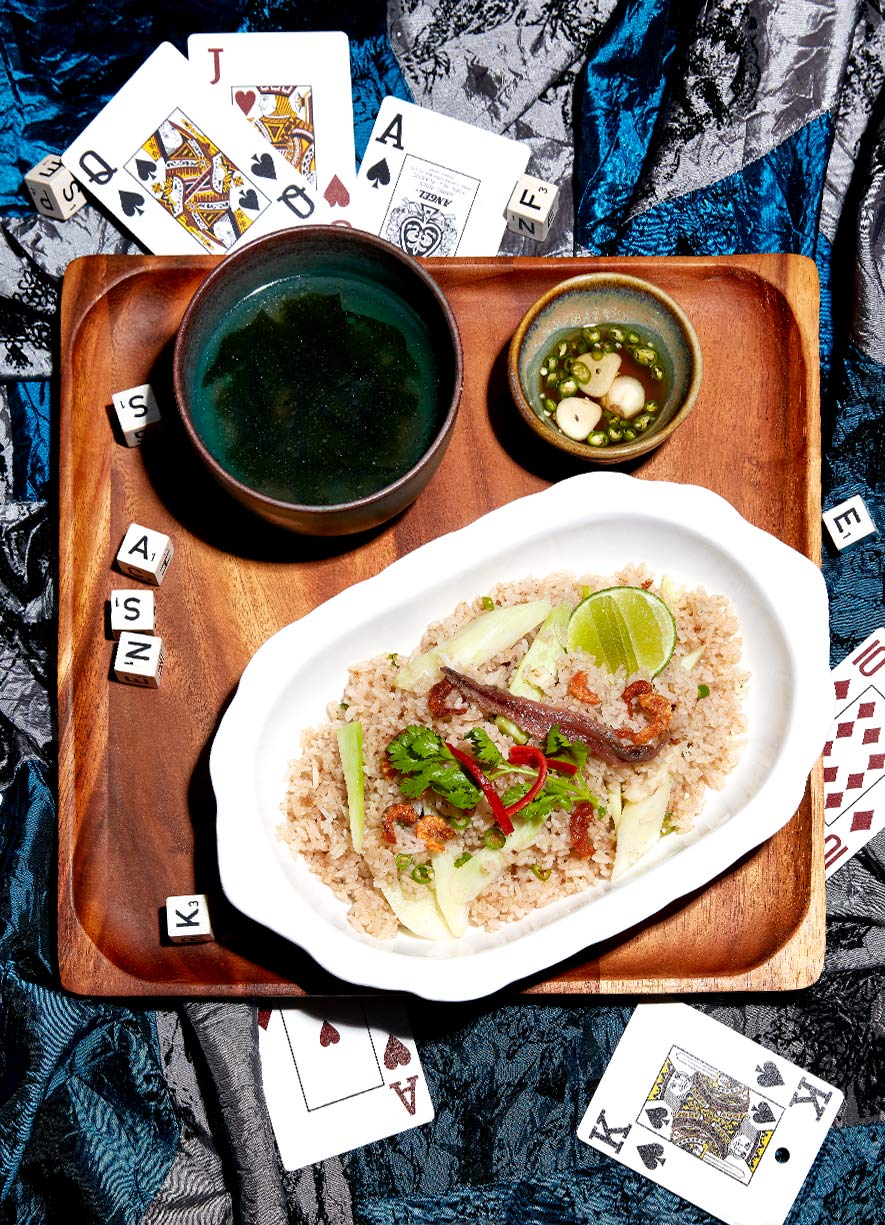 Egg and garlic fried rice with pancetta and crab meat. Served with Thai clear soup (Warning: For garlic lovers only).