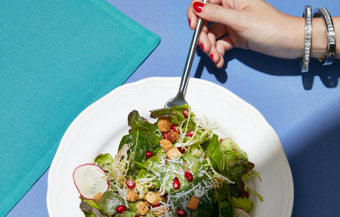 Wild rocket leaves, frisee, pomegranate seeds, watercress, top with grated Parmesan and balsamic vinaigrette.
