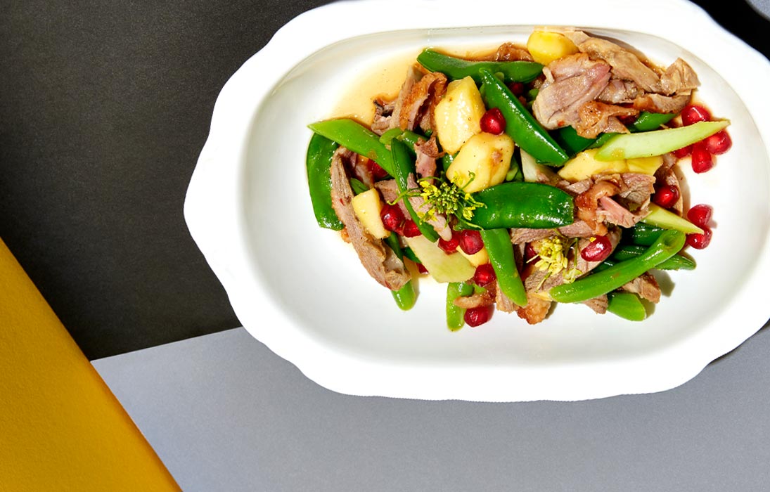 Five spices roasted duck, French beans, sugar snap peas, ripe mango, pomegranate seeds and dark soy sauce dressing.