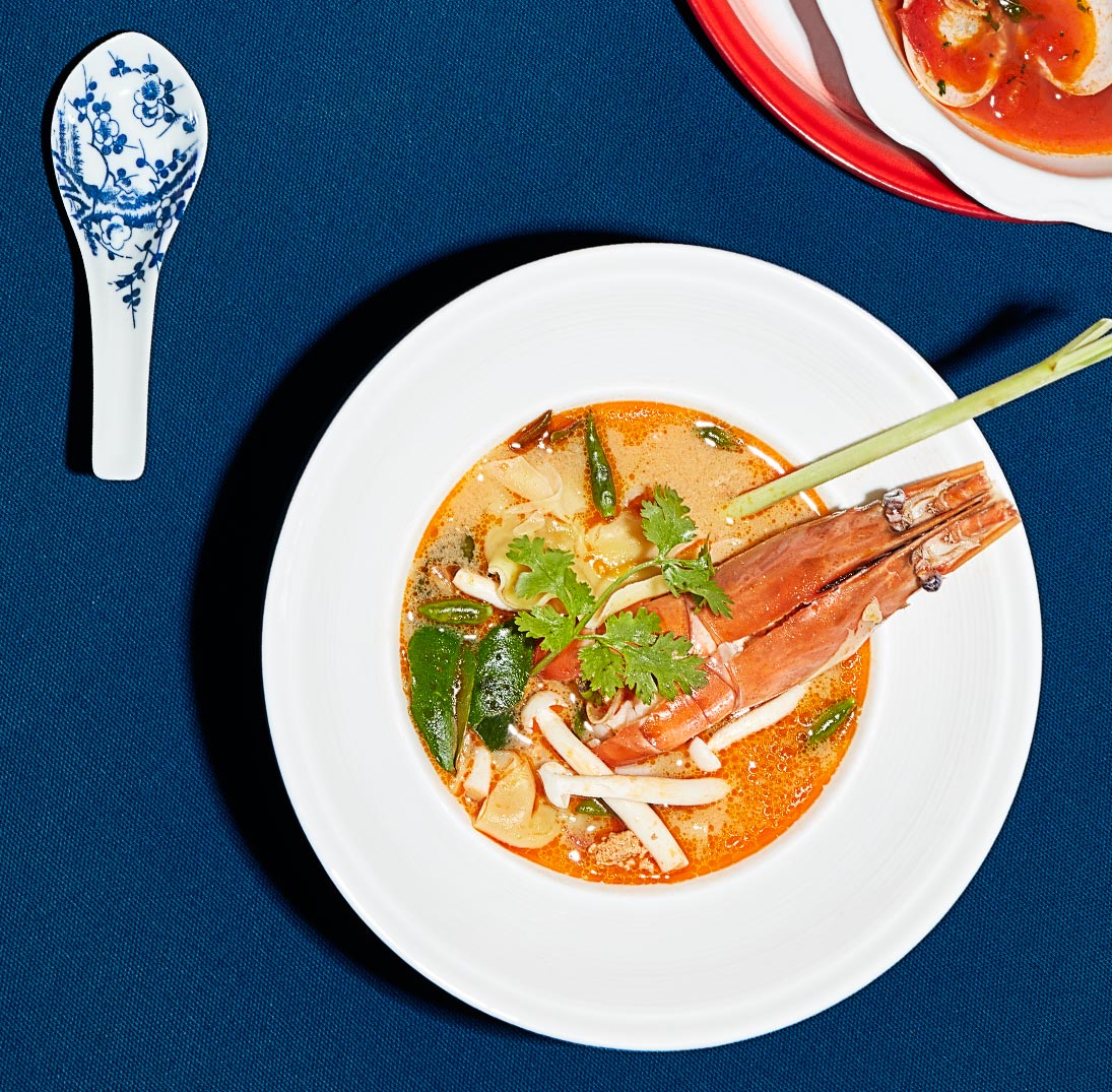 Famous Thai spicy soup with river prawn, shimeji mushroom, shrimp ravioli and aromatic Thai herbs.