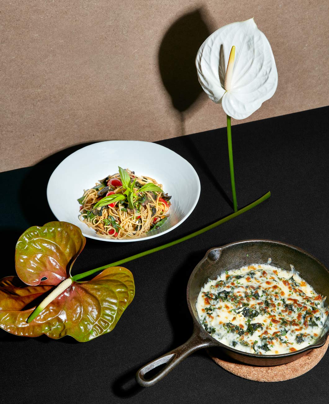 Stir-fried spaghetti with shitake, portobello mushroom, champignon, chilies, garlic and basil.
