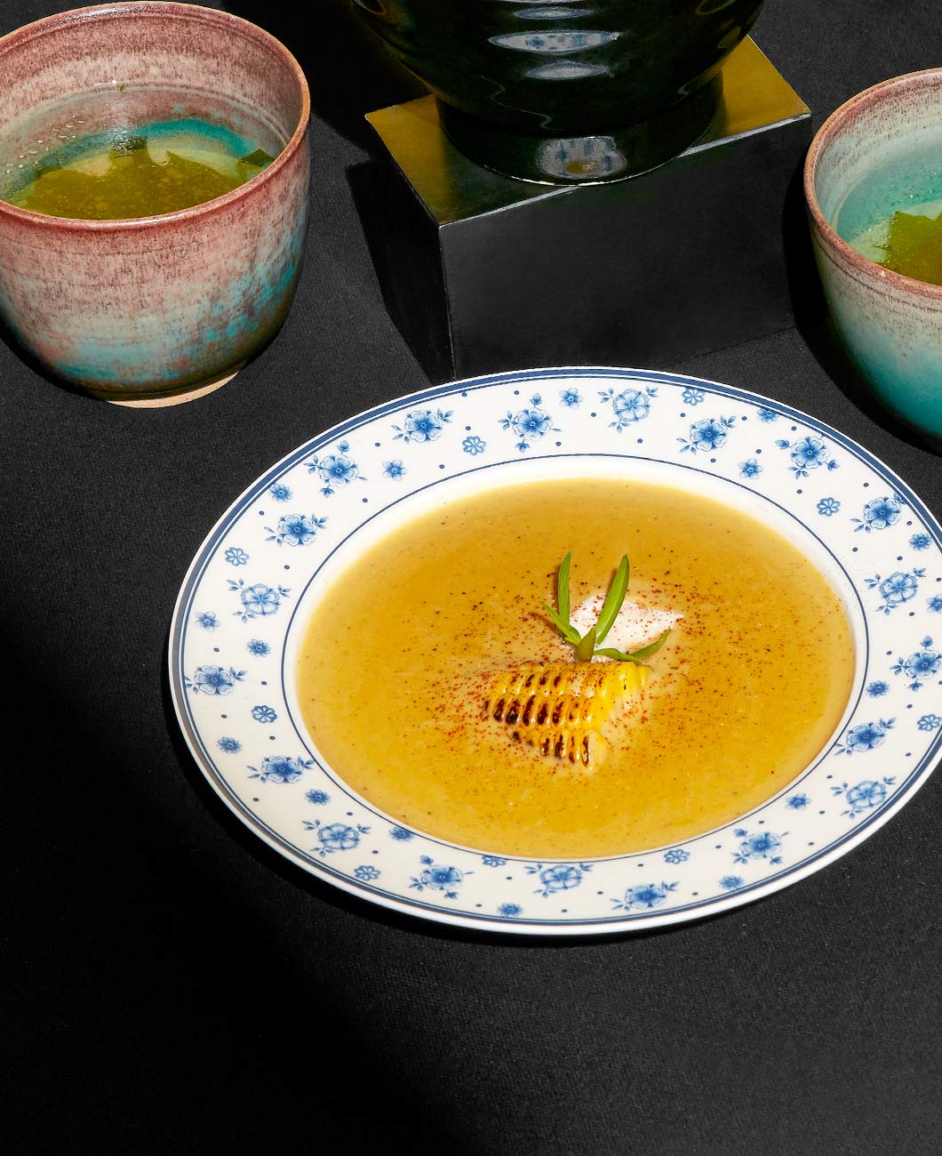 Chinese sweet corn with twists of grilled sweet corn and sour cream.
